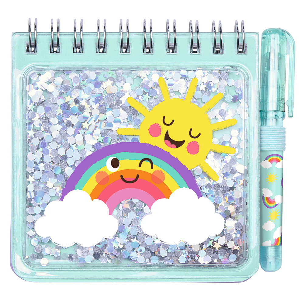 Pequeña libreta con confeti brillante en la portada. Cuenta con 70 páginas en blanco con un pequeño dibujo en la parte inferior. Incluye un bolígrafo de tinta azul sujetado por una cinta de goma.