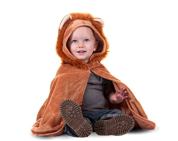 Capa reversible de terciopelo negro con capucha y orejas de murciélago, que se transforma en una capa roja con detalles de tela de araña y araña de felpa. Incluye máscara a juego para completar el disfraz.