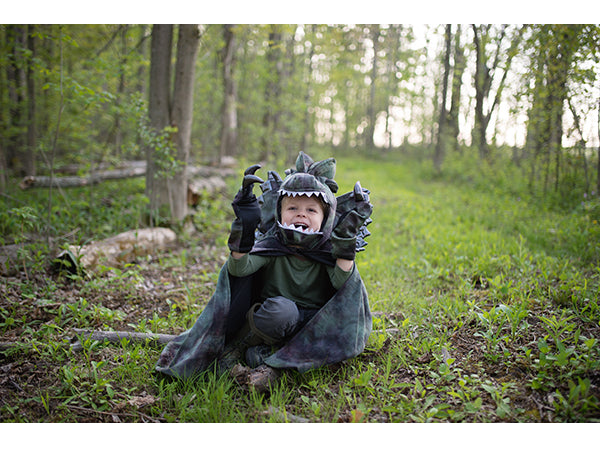 A los peques le encantará esta capa de dinosaurio totalmente monstruosa. Esta teñida a mano en verde, gris y negro con forro negro.