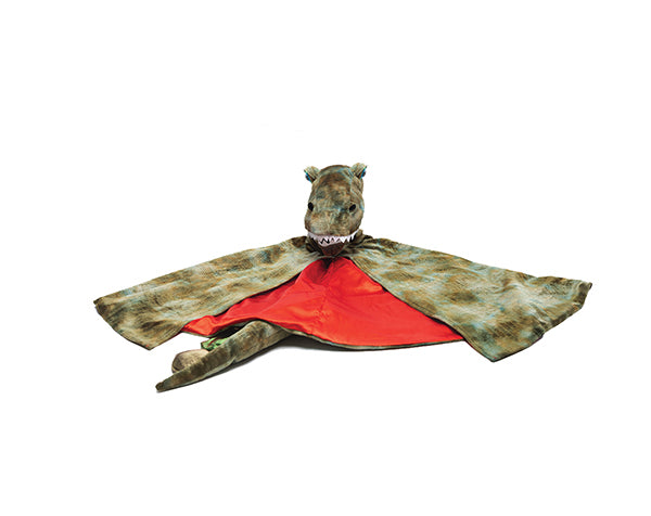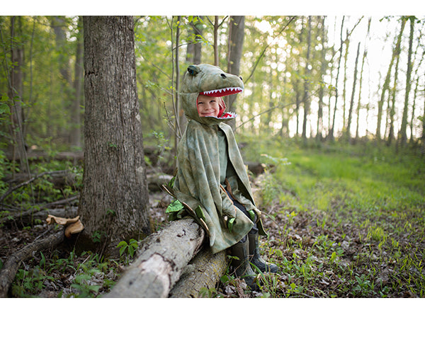 A los peques le encantará esta capa de dinosaurio totalmente monstruosa. Esta teñida a mano en verde, marrón con forro negro.