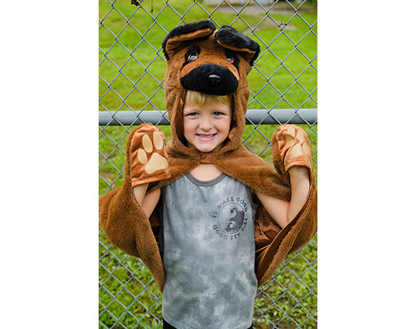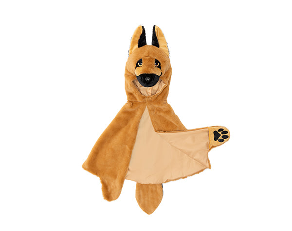 Capa con capucha de peluche imitando a un pastor alemán, detallada con orejas erguidas y felpa marrón realista. Cómoda y divertida, convierte el juego en una verdadera aventura canina.