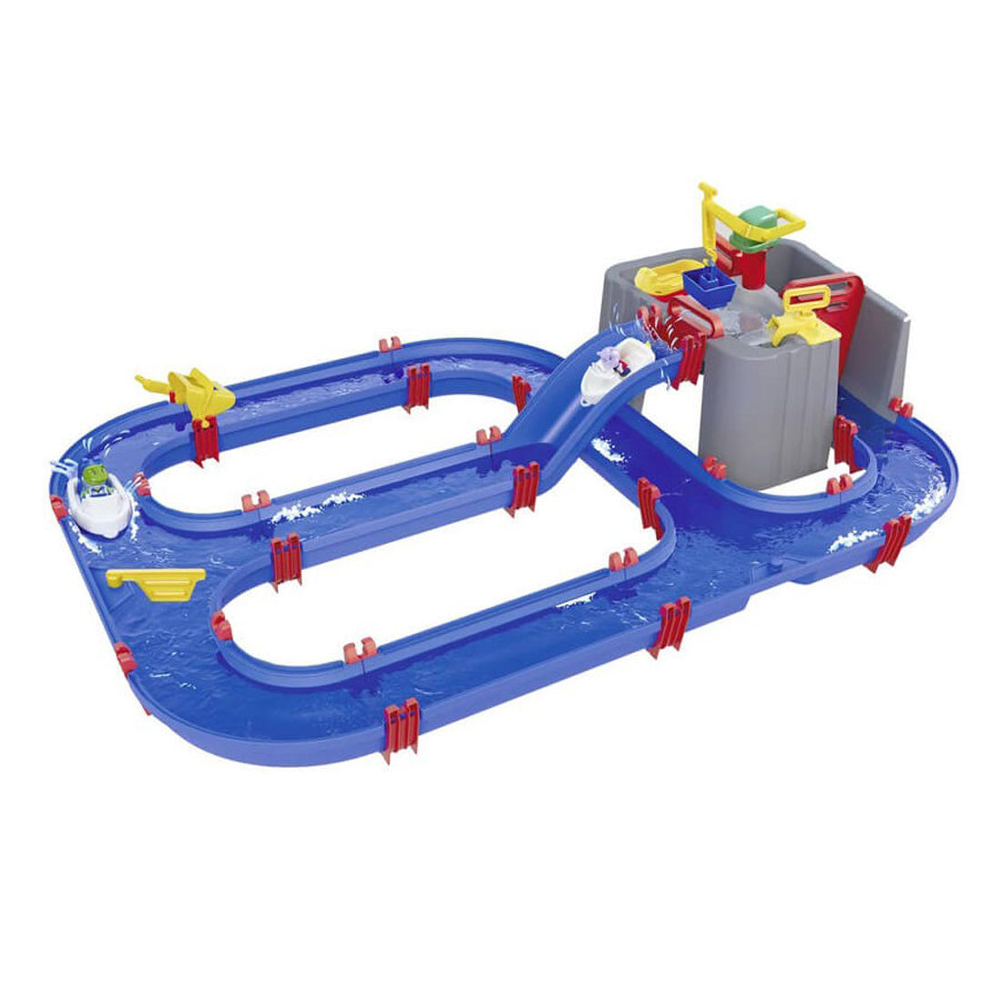 El AquaPlay Harbour está equipado con una grúa giratoria, una bomba manual de gran potencia, una rampa de dos alturas, compuertas que se abren y cierran, y un sistema de canales por los que los barcos pueden navegar libremente.