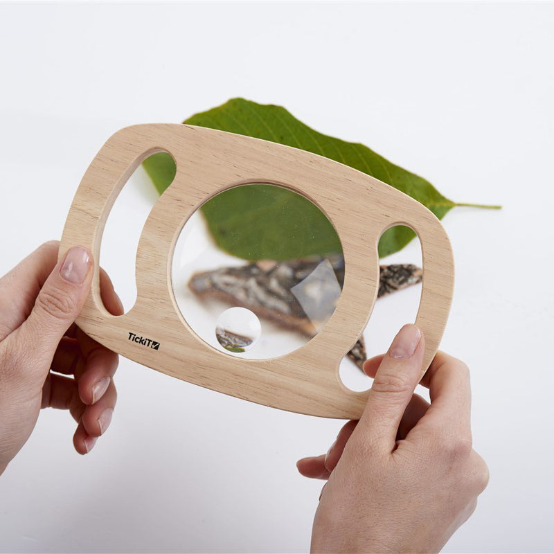 La lupa tickit ® Easy Hold tiene un marco de madera de caucho sólido con asas para que su hijo pueda sostenerlo fácilmente de forma independiente, con una lente de aumento con capacidad de aumento de 2x (con una lente insertada adicional con capacidad de aumento de 3x). Ideal para observar objetos pequeños, minibestias u ofrecer una perspectiva diferente del mundo que los rodea.