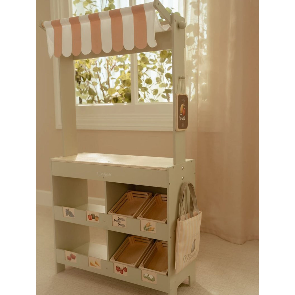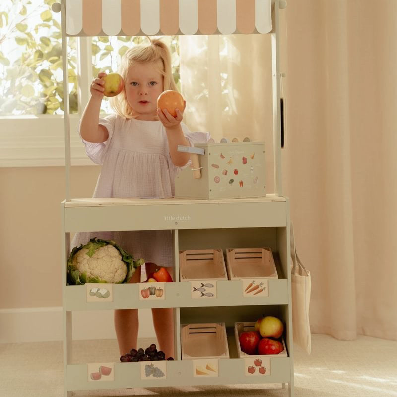 ¡Bienvenidos al mercado! Con este precioso puesto de madera, los niños pueden jugar a comprar en su propia tiendita. La marquesina de tela crea un auténtico ambiente de mercado, y con la pizarra y las tarjetas ilustradas, pueden exponer sus productos con estilo. El set también incluye una bolsa de la compra y cajas para una auténtica experiencia de compra. Dale la vuelta al puesto y se convierte en una cafetería, con menú y alegres ilustraciones.