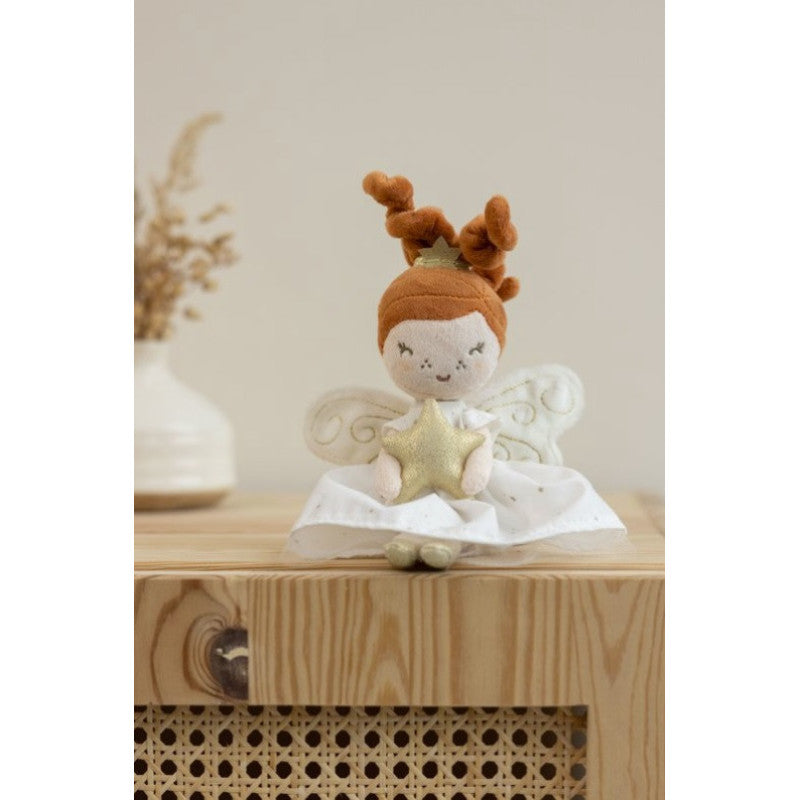 Será tu mejor amiga y cuidará de ti, siempre y en todo momento. Con su bonito vestido blanco, su coleta rizada de color rojo, sus alas de hilo dorado y sus zapatos de bailarina, Mia jugará con los sueños y animará a los niños a alcanzar las estrellas.