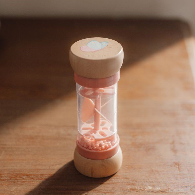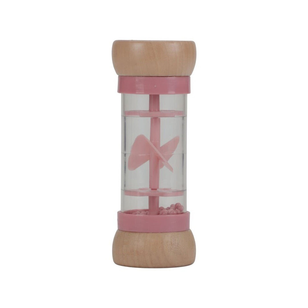 El sonajero de lluvia está diseñado para manos pequeñas y es cómodo de sostener. La parte superior e inferior de madera están decoradas con una ilustración de una flor y una mariposa de la colección Fairy Garden.