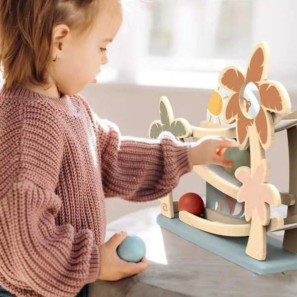 ¡A los pequeños les encantará ver cómo las tres bolas de madera ruedan por la rampa y salen disparadas al final! ¡Atrápalas antes de que se caigan, tendrás que ser rápido!