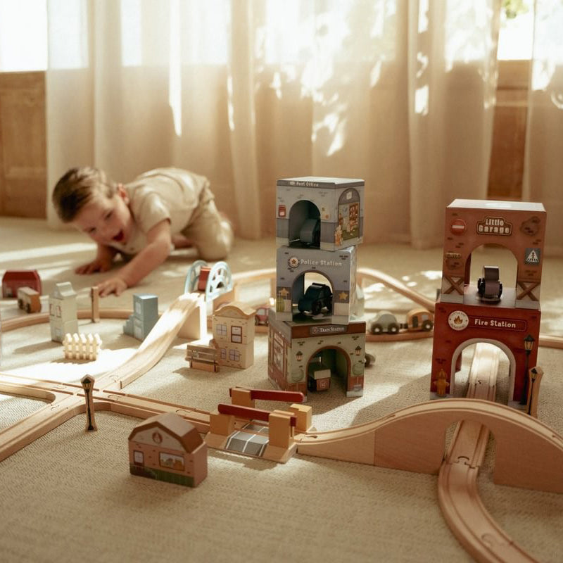 Apila los bloques uno encima del otro o colócalos sobre el Ferrocarril XL, permitiendo que los vehículos pasen por debajo sin esfuerzo. Cada bloque tiene ilustraciones únicas y su propio vehículo que encaja a la perfección. ¡Una forma divertida de estimular la imaginación y la motricidad fina!